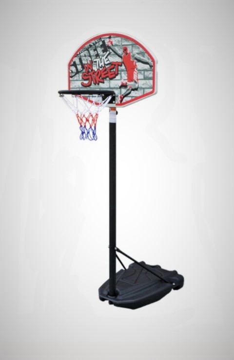 Streetball, basketbal souprava dětská. Koš s ocelovou konstrukcí, plastovou deskou a podstavcem pro vnitřní i vnější použití. Deska o rozměrech 66 x 46 cm; materiál desky PE; kovová obroučka o průměru 32 cm; nastavitelná výška obroučky nad zemí 140 - 190 cm; barevná síťka. Celkové rozměry 66 x 110 x 183 cm (šířka x hloubka x výška); PE základna 66 x 46 x 12 cm, lze naplnit 30 l vody; hmotnost 6 kg. Hmotnost balení 6.70 kg; rozměry balení (v x š x h): 51 x 68 x 16 cm.