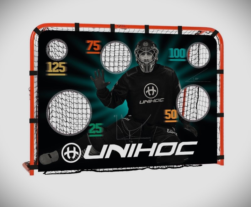 Florbalový autobrankář Unihoc Ball Buster Large slouží pro nácvik přesnosti střelby. Plachta obsahuje několik různě velkých otvorů a připevňuje se na florbalovou branku pomocí pásků na suchý zip. Velikost plachty je určená pro bránu o rozměru 160 x 115 cm.