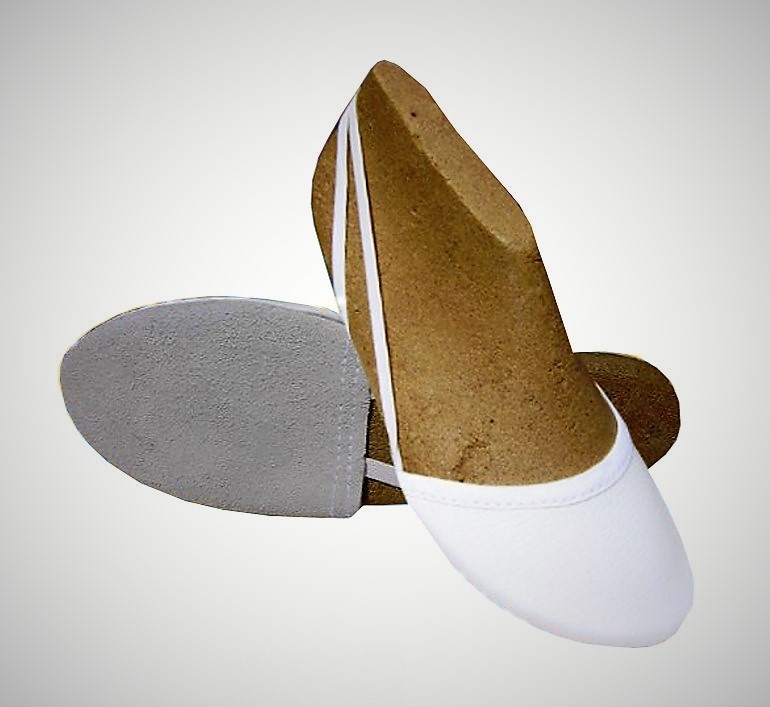 Gymnastické špičky, cvičky ve velikosti 34 - 48. Svršek gymnastických špiček je vyroben z přírodní upravené usně (vepřovice), která se vytvaruje podle tvaru chodidla, po několikerém použití změkne. Podešev je z chromové kůže, mírně klouže. VYROBENO V ČESKÉ REPUBLICE.