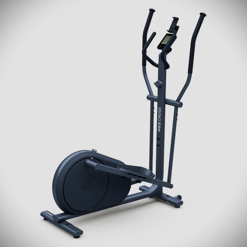 Eliptický trenažér HOI CROSS Stone eliptický magnetický trenažér, manuální nastavení zátěže v 10 stupních, délka kroku 39 cm, Bluetooth rozhraní, držák na láhev s vodou, LCD displej s intuitivním ovládáním, držák na tablet, 14 kg setrvačník, hmotnost 56,5 kg, nosnost 110 kg. Technické parametry trenažéru: Magnetický brzdný systém s tichým chodem. Plynulá regulace brzdného odporu závisle na otáčkách. Rozsah zátěže v rozmezí 1-10 stupňů si lze manuálně nastavit pomocí regulačního kolečka. Tichý převodový systém. Kloubová spojení jsou osazena průmyslovými ložisky, energie vynaložená na šlapání se převádí do setrvačníku pomocí plochého průmyslového řemene s podélným drážkováním. Setrvačník o hmotnosti 14 kg je kalibrován proti kmitu. Vybavení trenažéru. Ergonomicky tvarované kyvné páky pro trénink horní části těla, dodatečné držadlo uprostřed pro intenzivní trénink dolní části těla, protiskluzové nášlapné plochy, stojánek na smartphone nebo tablet, držák na láhev s vodou, kolečka pro manipulaci (umístěná vpředu), mechanismus vyrovnávání nerovností podlahy (vpředu i vzadu). Měření pulsu. Bluetooth rozraní a ANT+ pro propojení s hrudním pásem (volitelné příslušenství), HOI CROSS je vybaven integrovaným přijímačem signálu z hrudního pásu. Napájení trenažéru. Tužkové baterie (2 × AA - 1,5 V). Minimální nároky na prostor. Rozměry po sestavení (d × š × v): 134 × 61 × 169,5 cm. Hmotnost: 56,5 kg.