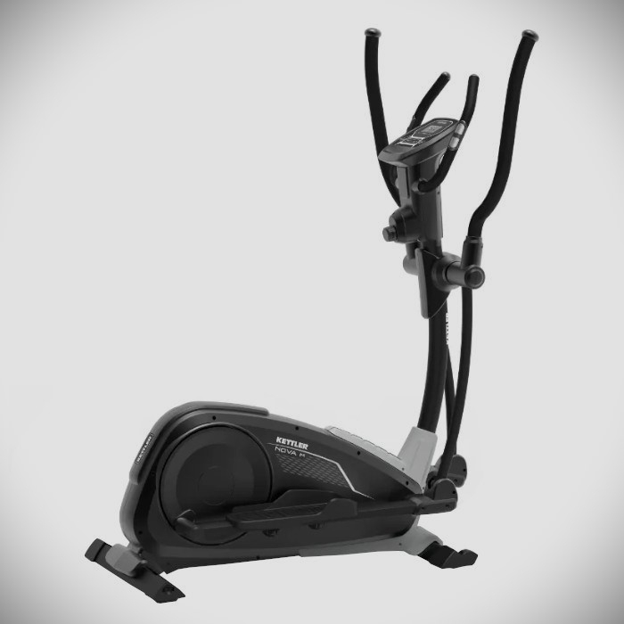 Eliptický trenažér KETTLER NOVA M Black eliptický trenažér, manuálně ovládaná magnetický brzda, 8 stupňů zátěže, LCD displej, funkce Recovery, délka kroku 32 cm, šířka nástupu 20 cm, dlaňové senzory, pevná a stabilní konstrukce, 12 kg setrvačník, hmotnost 52 kg, nosnost 110 kg. Technické parametry trenažéru: Magnetický brzdný systém s tichým chodem. Plynulá regulace brzdného odporu závisle na otáčkách. Rozsah zátěže v rozmezí 1-8 stupňů si lze manuálně nastavit pomocí otočného regulátoru. Údaj o zátěži se zobrazuje na číselníku nad ovladačem zátěže. Tichý převodový systém. Všechny kloubové spoje jsou osazeny ložisky, energie vynaložená na šlapání se převádí do setrvačníku za pomoci plochého průmyslového řemenu s podélným drážkováním. Setrvačník o hmotnosti 12 kg je kalibrován proti kmitu. Elektronické měření pulsu. Dodatečné držadlo umístěné u displeje je vybaveno dlaňovými senzory pro snímání pulsu. Ergonomicky tvarované kyvné páky, úzký rozestup nášlapů pro přirozený pohyb, nastavitelné protiskluzové nášlapy je možné polohovat podle postavy. Vyrovnání nerovností podlahy. Vysoká stabilita díky výškovému vyrovnání nerovností podlahy (umístěno vzadu). Stabilní konstrukce ze značkové oceli. Ocelový rám umožňuje zatížení 110 kg. Hmotnost trenažéru je 52 kg. Snadná manipulace. Pevná kolečka (umístěná vpředu) zajišťují pohodlnou manipulaci a snadné přesouvání trenažéru. Napájení tužkové baterie (2 × AA - 1,5 V). Minimální nároky na prostor. Rozměry po sestavení (d × š × v): 115 × 62 × 160 cm. Délka kroku je 32 cm a šířka nástupu 20 cm.