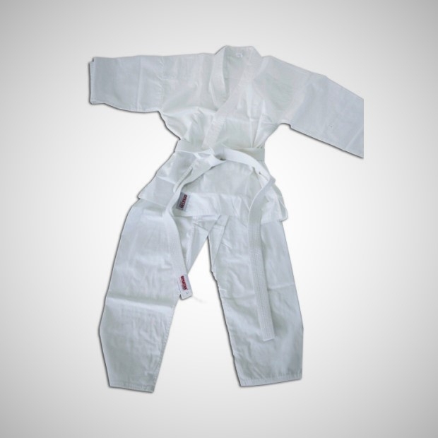 Kimono na karate. Kimono pro trénink i soutěž. Barva kimona bílá. Univerzální střih pro pohodlný a snadný pohyb. Kalhoty s dvojitou výztuhou a gumou v pase. Materiál 100% bavlna. Součástí balení opasek v bílé barvě.