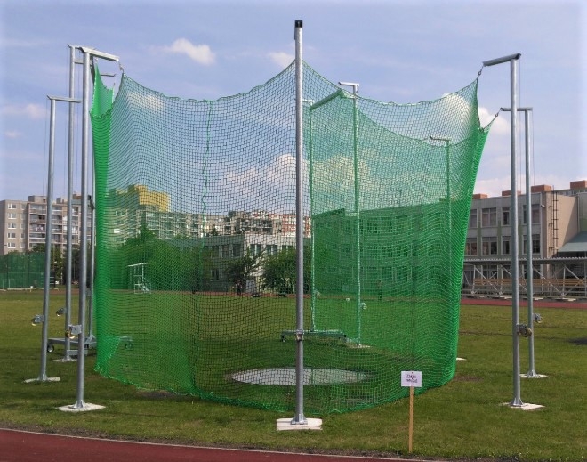 Hliníkové sloupy o výšce 5 m, průměr 100 mm v zadní části, vpředu sloupy o výšce 7 m a vrata o výšce 7 m, průměr 100 mm. Ochranné klece rozlišujeme podle toho, zda jsou určeny pouze na hod diskem (nižší a bez posuvných vrat) nebo klece určené i pro hod kladivem (vetšinou se staví kombinované, aby se v nich mohl házet také disk – ten má buď svůj vlastní odhodový kruh nebo se do diskařského kruhu vkládá tzv. redukce, která zmenší průměr odhodového kruhu z 2500 mm na 2135 mm). Ochranné klece se dodávají ocelové a hliníkové. Výhodou ocelových je jejich pevnost, hliníkové jsou vyhledávány především pro svoji odolnost vůči korozi a snažší manipulaci. Velkou pozornost je třeba věnovat umístění patek a dostatečně robustnímu zabetonování, aby nedošlo k poškození povrchu ani klece.Také je třeba pamatovat, že vrata kladivářské klece jsou posuvná a potřebují zpevněnou plochu, po které jezdí kolečka vrat. Dodáváme také jiné rozměry klecí, klece do stávajících (již zabetonovaných patek)a jiné provedení speciálně upravené podle potřeb stadionu. Klec je včetně sítě. VYROBENO V ČESKÉ REPUBLICE.