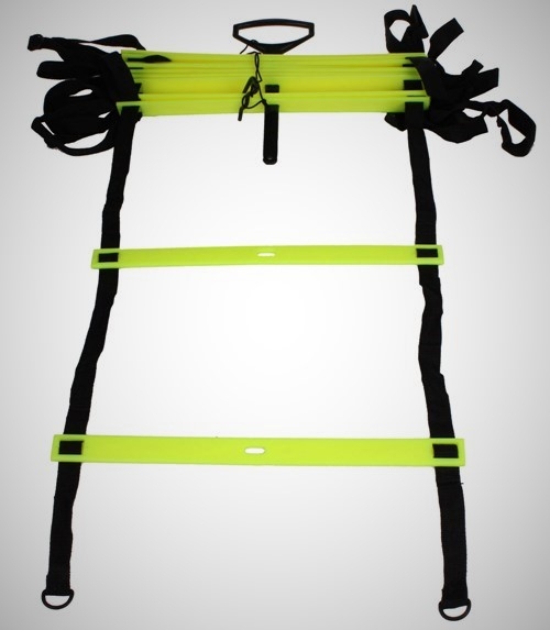 Žebřík pro kondiční přípravu sportovců. Plastové příčky žebříku jsou napevno fixované v rozestupech po 38 centimetrech. Délka 9 m.