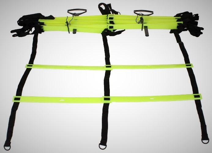 Dvojitý agility žebřík pro kondiční přípravu sportovců. Plastové příčky žebříku jsou snadno nastavitelné pro přizbůsobení vzdálenosti mezi jednotlivými příčkami podle potřeb uživatele. Unikátním vylepšením jsou madla, která je možné protáhnout středy obou žebříků. Madla pak slouží nejen jako nosič, ale zabraňují i zamotání žebříků. Délka 9m.