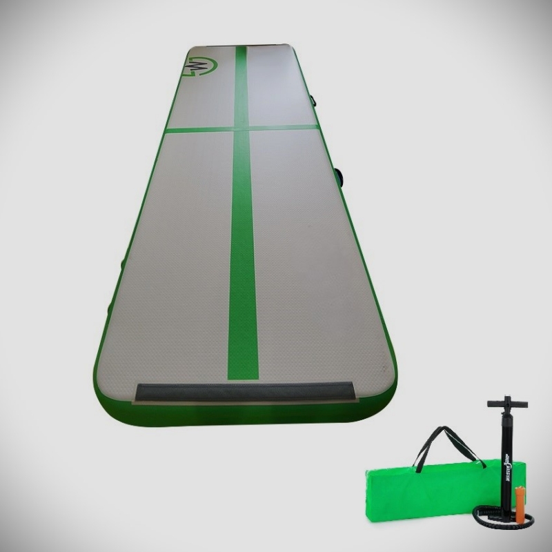 Profesionální airtrack, který je vhodný jak do klubů, tak i pro malé akrobaty na cvičení doma. Je vyroben z vysoce odolného materiálu s CE certifikátem. Materiál je vysoce odolný. Není to materiál používaný na nafukovací hračky, jako u levnějších airtracků. Bez problémů můžete airtrack vzít i do bazénu či moře. Materiál i lepidlo jsou pro tyto činnosti přizpůsobené. Zkoušíte přemety, salta na trampolíně a chtěli byste je umět i na zemi? Airtrack je ideální pomůcka pro přechod z trampolíny na zem. Tato nafukovací žíněnka je vhodná především pro gymnastiku, parkour, tanec, bojové sporty, či další akrobatické sporty. Airtrack najde využití také v každém fitness centru, ve školách, a nebo jen tak pro volný čas doma či na zahradě. Můžete ho použít také pro dovádění na vodě. Díky 20 cm výšce nafouknuté žíněnky snižuje riziko zranění při cvičení. Tlumí nárazy a ideálně pruží. Pokud Air Track nebudete používat, můžete jej jednoduše vyfouknout a sbalit pro úsporu místa, či přenést na vaše oblíbené místo. Technická data: Profesionální airtrack; barva zelená; rozměr 300 x 100 cm; výška 20 cm; materiá tělo: 20 cm dropstitch zesílená dvoustěnná tkanina DWF (Double Wall Fabric) s 0,9 mm PVC vyztuženou tkaninou, boky: vysoce kvalitní potah z PVC o síle 0,9 mm. Příslušenství: vysokotlaká pumpa s tlakoměrem, sada na opravu, přepravní obal na airtrack; středová čára o šířce 10 cm (stejná šířka jako gymnastická kladina). Potisk odolný vůči UV záření; pevná gumová madla; kvalitní ventily Bravo (vyměnitelné); nosnost 200 kg; nosnost při použití na vodě 100 kg. Hmotnost balení 13 kg; rozměry balení (V x Š x H): 27 x 111 x 22 cm.