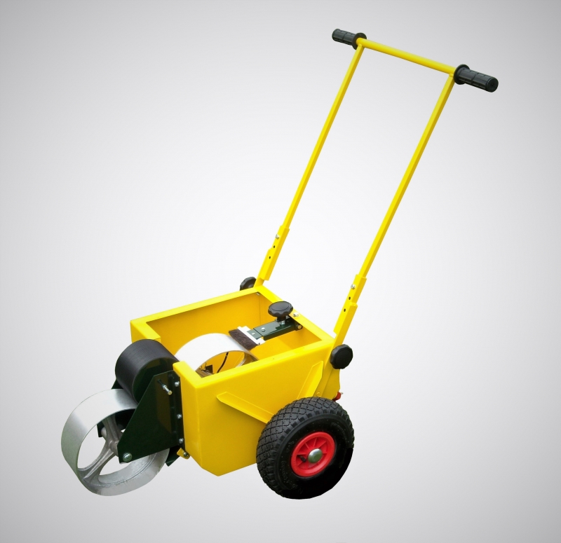 Fotbalová lajnovačka latexová, válcová. Návod a údržba : Po vyjmutí z krabice nasadíme kola a zajistíme proti vysunutí kovovými zátkami, které narazíme na hřídele. Do předního držáku, po vyjmutí čepu, nasadíme pogumované kolo a čep zasuneme zpět, druhé pogumované kolo položíme na vidlice v nádobě lajnovačky. Nasadíme menší přenosové kolo mezi pogumovaná a vymezíme boční vůli šrouby. Do středního kola pro lepší zatížení nasypeme libovolný sypký materiál. Kartáčkem regulujeme sytost lajny. Smontujeme a nasadíme držadlo. Nalijeme náplň – tekuté vápno nebo latex, doporučujeme přidat malířskou bělobu. Po použití řádně vystříkáme nádrž vodou a občas namažeme kluzné plochy !!!!!!!! Jako náplň do lajnovačky doporučujeme použít originál značkovací barvu PRO LAJNOVAČKY, kterou můžete objednat pod kódem 2107. Jako levnější alternativu lze použít latexovou barvu, kterou lze zakoupit v obchodě s barvami. Do latexové barvy je vhodné přidávat malířskou bělobu. VYROBENO V ČESKÉ REPUBLICE.
