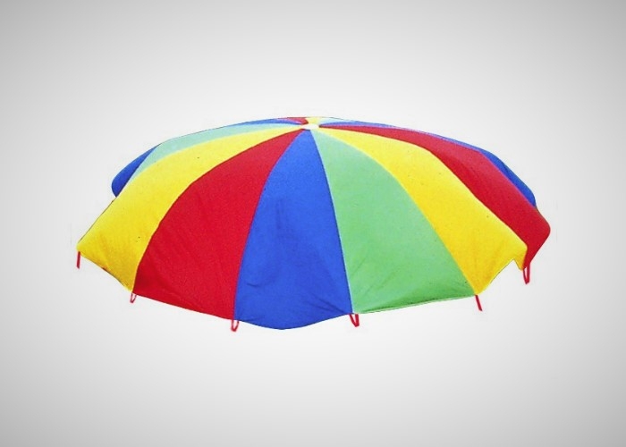 Padák dětský 5 m pro motoriku, 16 polí, 16 úchytů, všitá šňůrka, středový otvor. Možné objednat i 3m a 4m padák. Ilustrační foto.