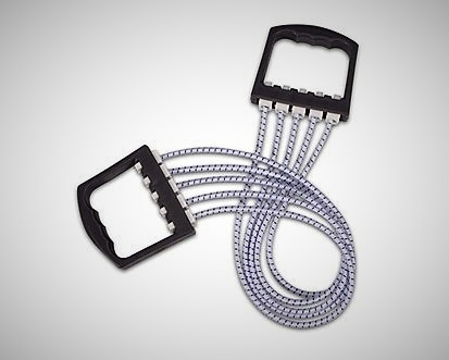 Pružinový posilovač - 5 gum. Účinný posilovač hrudníku, ramen, paží a zad. Pět masivních gumolan, plastová ergonomická držadla. Možná korekce odporu odejmutím gumolan k snížení zátěže.