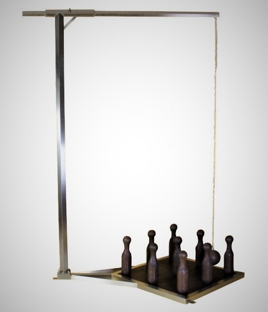 Kuželky komplet PŘENOSNÉ (ocelová konstrukce komaxit, plastové kuželky, koule). Tyto přenosné kuželky jsou vhodné tam, kde je nechcete mít nastálo nebo je můžete vozit na různé akce. Můžete je umístit do unteriéru i exteriéru. Povrch kuželek je z recyklovaného plastu, který má hrubší strukturu, což je výhodou hlavně u koule, která tak nemůže samovolně vyklouznout z ruky. Hra v kuželky je sportovní hra s dlouhou tradicí, která po staletí přináší lidem radost, zábavu a zdravý pohyb, což jsou základní předpoklady uchování duševního a tělesného zdraví v dnešní uspěchané době. Výška kuželek je 38 cm, průměr 10 cm. Výška konstrukce 2,4 m. Ilustrační foto (na obrázku je materiál šibenice nerez), povrchová úprava inzerovaných kuželek je komaxit!!!. VYROBENO V ČESKÉ REPUBLICE.