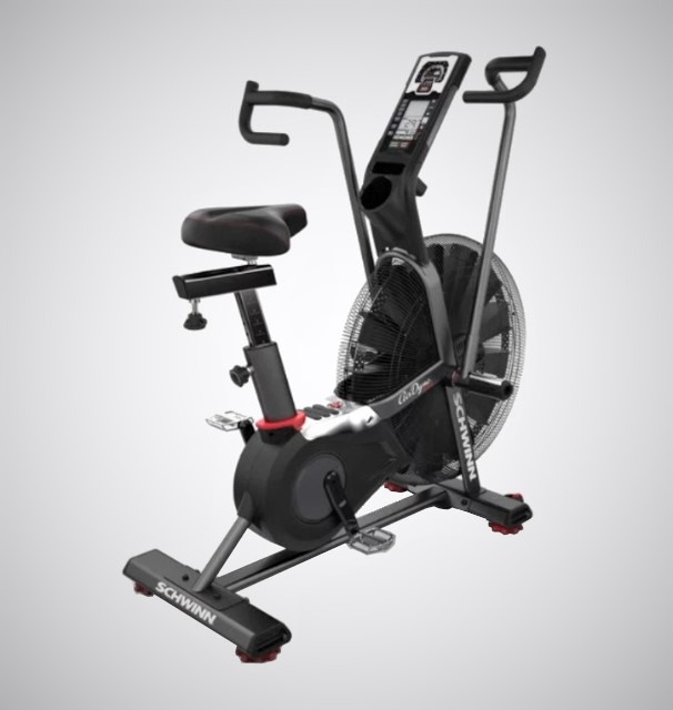 Rotoped SCHWINN AIRDYNE AD8 rotoped se vzduchovým odporem, neomezená zátěž, 9 tréninkových programů, multifunkční LCD displej, sedlo s nastavitelnou výškou i horizontálním posuvem, držák na láhev, transportní kolečka, hmotnost 51 kg, nosnost 159 kg. Technické parametry a vybavení: Patentovaný systém vzduchového odporu s neomezenou zátěží. Intenzitu tréninku si uživatel reguluje rychlostí šlapání – čím rychleji šlape do pedálů, tím větší je odpor. Elektronické měření pulsu prostřednictvím hrudního pásu (volitelné příslušenství). Integrovaný přijímač signálu z Cardio Puls Setu. Vybavení: Komfortní sedlo s možností rychlého nastavení výšky a horizontálního posuvu, multipoziční madla, pedály s protiskluzovou úpravou, držák na láhev s vodou a mechanismus vyrovnávání nerovností podlahy (vzadu i vzadu). Ocelová rámová konstrukce s práškovým nástřikem a s vysokou stabilitou snese nadstandartní zatížení až 159 kg. Snadnou manipulaci i přemísťování trenažéru zajistí transportní kolečka (umístěná vpředu). Napájení: Baterie (2 × LR20/D). Rozměry: Po sestavení (d × š × v): 135 x 67 x 135 cm. Hmotnost: 51 kg.