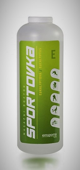 Eukalyptová působí proti bolestivosti a únavě svalstva. Je určena pro krátkodobou masáž a automasáž k odstranění bolesti svalstva a pohybového ústrojí z přetížení. Balení: 200 ml SPORTOVKA je moderní masážní a regenerační prostředek, určený pro krátkodobou masáž a automasáž výkonných sportovců i běžných spotřebitelů. Vyváženým obsahem etanolu, glycerinu, aromatických kompozic, funkčních látek a vody se masáží docílí optimálního stavu pokožky a zvýšené odolnosti proti mikrobiologickým vlivům. Sportovka je dokonale vyvážená jak svým vonným charakterem, tak vhodným složením a i speciální vůní, vyvolává pocit čistoty a svěžesti. SPORTOVKA je masážní roztok používaný samostatně nebo v aplikaci s masážní emulzí EMSPOMA, kde u jednotlivých druhů zvyšuje účinek funkčních látek. VYROBENA V ČESKÉ REPUBLICE.