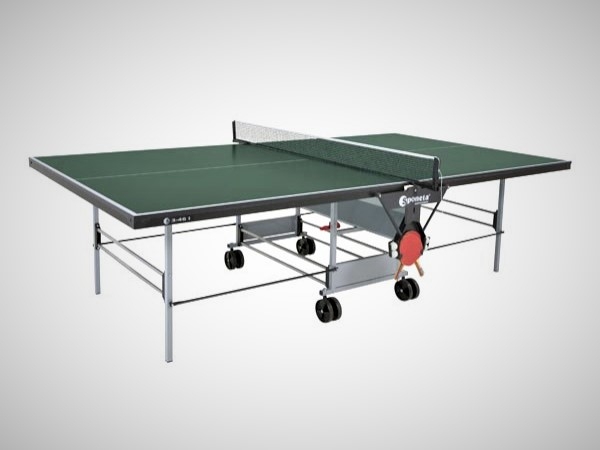 Stůl na stolní tenis Sponeta S3-46i interiérový, pojízdný se stojánkem a síťkou, se zesílenou okrajovou lištou, masivní a odolný pojezd pro interiérové použití (není odolný proti povětrnostním vlivům a UV záření) hrací plocha: dřevotřísková deska 19 mm, rámový profil 36 mm podvozek: Automatic (pojízdný stůl s podvozkem pro obě desky, každá z desek může být sklopena nezávisle na druhé) kolečka: 4 dvojitá kolečka průměr 125 mm, všechna kolečka otočná, síťka: ano, speciální vybavení: držák na míčky a pálky, ochrana proti vstupu mezi desky rozměr pro uskladnění: 152,5x66x187 cm. Hmotnost 73 kg.