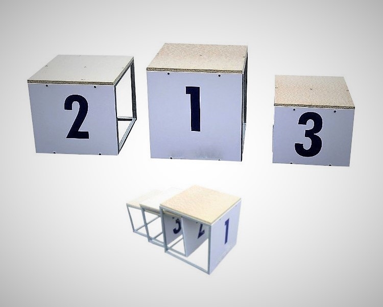 Stupně vítězů stohovatelné se skládají ze tří samostatných stupňů. Celková hmotnost všech tří dílů cca 25 kg. Jsou vyrobeny z kovové konstrukce s antikorozní úpravou. Nášlapné desky jsou z překližky - minimální nosnost je 100 kg/jeden stupeň, čelní desky s umístěním (1, 2, 3), jsou z plastu. Rozměry výška/plocha pro stání jsou: stupeň "1": 51,5/50 x 50 cm stupeň "2": 42,5/49 x 45 cm stupeň "3": 34,5/48 x 40 cm. VYROBENO V ČESKÉ REPUBLICE.