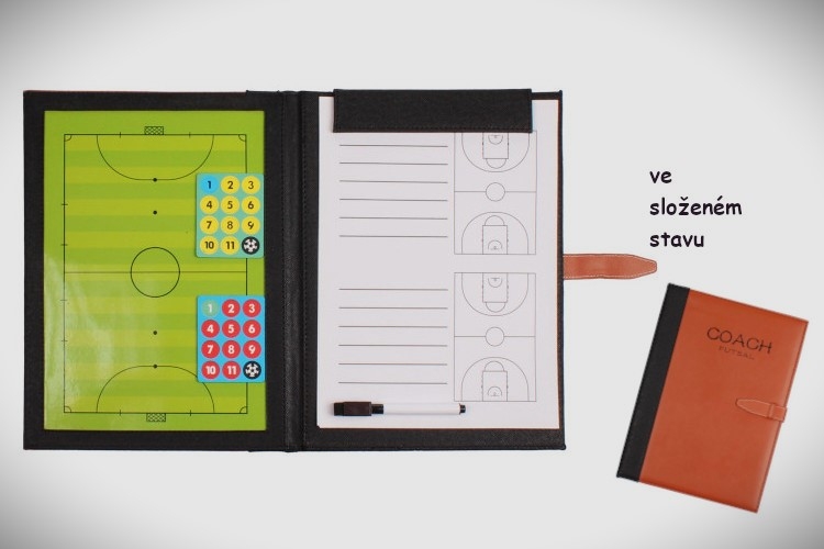 Taktická tabule pro futsal. Součástí sada magnetů, popisovač a houbička. Rozměr desek 32 x 24 cm. Patří mezi vybavení trenérů soutěžních futsalových klubů pro demonstrování a plánování herního postupu. Tvrdé magnetické desky tabule jsou zhotovené ze syntetické PU kůže s celkovou hmotností přibližně 600 gramů. Magnetická trenérská tabule po rozložení znázorňuje na jedné polovině celé futsalové hřiště ve formátu A4. Druhá strana desek je doplněná magnetickým klipem s předtištěnými papíry pro vyplnění herních postupů a strategií. Pro rozmístění hráčů v poli využijete dvě sady magnetů s čísly (11 žlutých, 11 červených a 2 černé). Pro znázornění dalších strategických pokynů poslouží černý popisovač s houbičkou. Rozměry tabule v zavřeném stavu jsou 32 x 24 cm (formát A4).