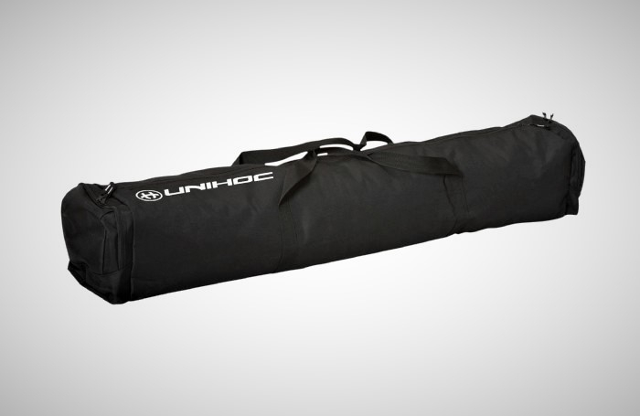 Taška až na 20 ks florbalových hokejek značky UNIHOC nebo pro volejbalovou síť a 6 volejbalových míčů. Dvě ucha na nošení v ruce, hlavní kapsa na zip a dvě menší kapsy na zip. Bílý potisk Unihoc. Objem 70 l, barva černá, velikost 92 - 104 cm.