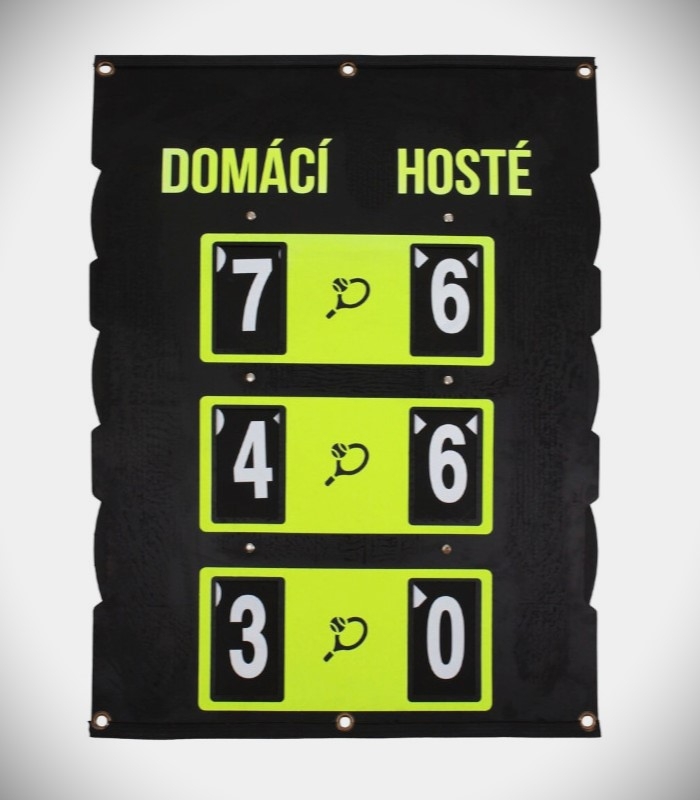 Oboustranný ukazatel skóre pro tenisové hráče a kluby. V českém jazyce, rozměr 83 x 58 cm. Tří-setový ukazatel skóre s rozpětím bodů 0 – 7 má 9 cm velké bílé číslice na kontrastním černém podkladu a neonově žlutém pozadí, aby bylo skóre dobře viditelné pro hráče i pro diváky. Pohyb číslic zajišťují manuálně posuvná kola po stranách ukazatele. Celkové rozměry ukazatele vyrobeného z odolného ABS plastu jsou 83 x 58 cm a na svém horním i dolním pogumovaném okraji je doplněný otvory pro zavěšení. Vzhledem k použitému materiálu má Scoreboard nízkou hmotnost 3,4 kg a je vhodný pro vnitřní i pro vnější používání a to i za nepříznivých klimatických podmínek. Tento model je vyrobený s českými nápisy. Technické parametry: Materiál: ABS plast, guma; rozměry: 83 x 58 cm; hmotnost: 3,4 kg; jednoduché používání; kovová oka pro zavěšení; pro indoor i outdoor použití.