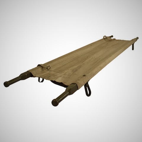 Zdravotnická nosítka - skládací, kovová konstrukce s dřevěnými madly. Povrch nosítek je z režné bavlny, rozměry: cca 52 x 230 cm, váha 7,5kg. Repasovaná.