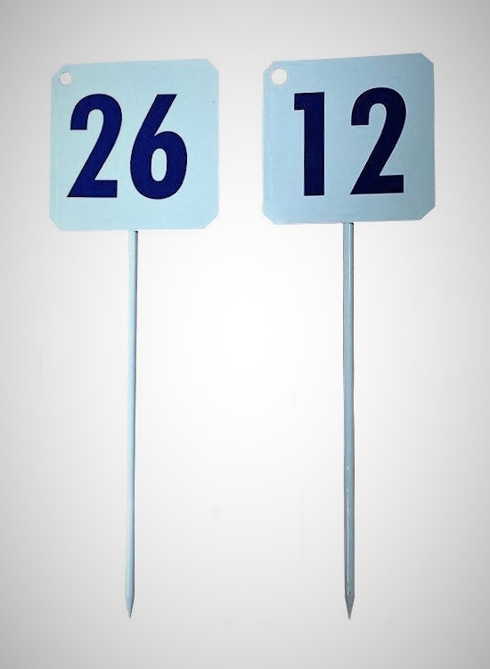 Značící sada 10ti terčíků k zabodnutí do země, ocelové, práškově lakované, tmavě modré číslice. Terčíky jsou v bílé nebo žluté barvě dle možností výroby a skladu. Výška samotného terčíku je cca 30 cm a destička s číslem má 10 x 10 cm. Ilustrační foto.